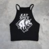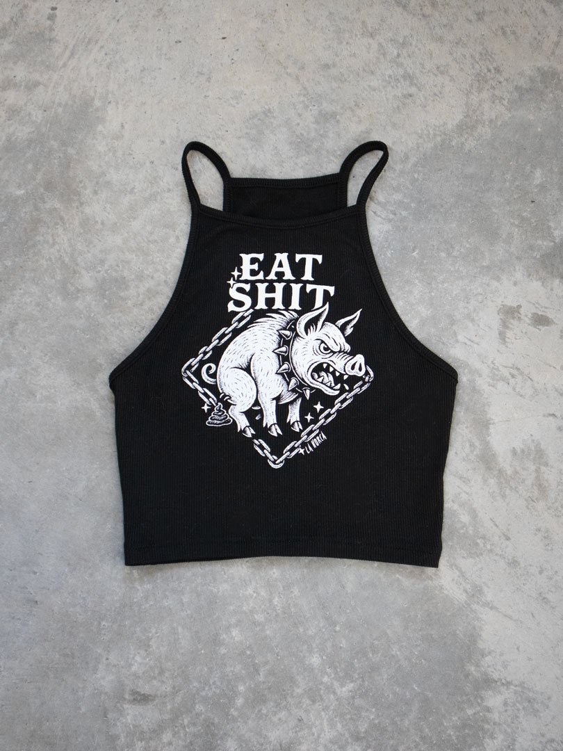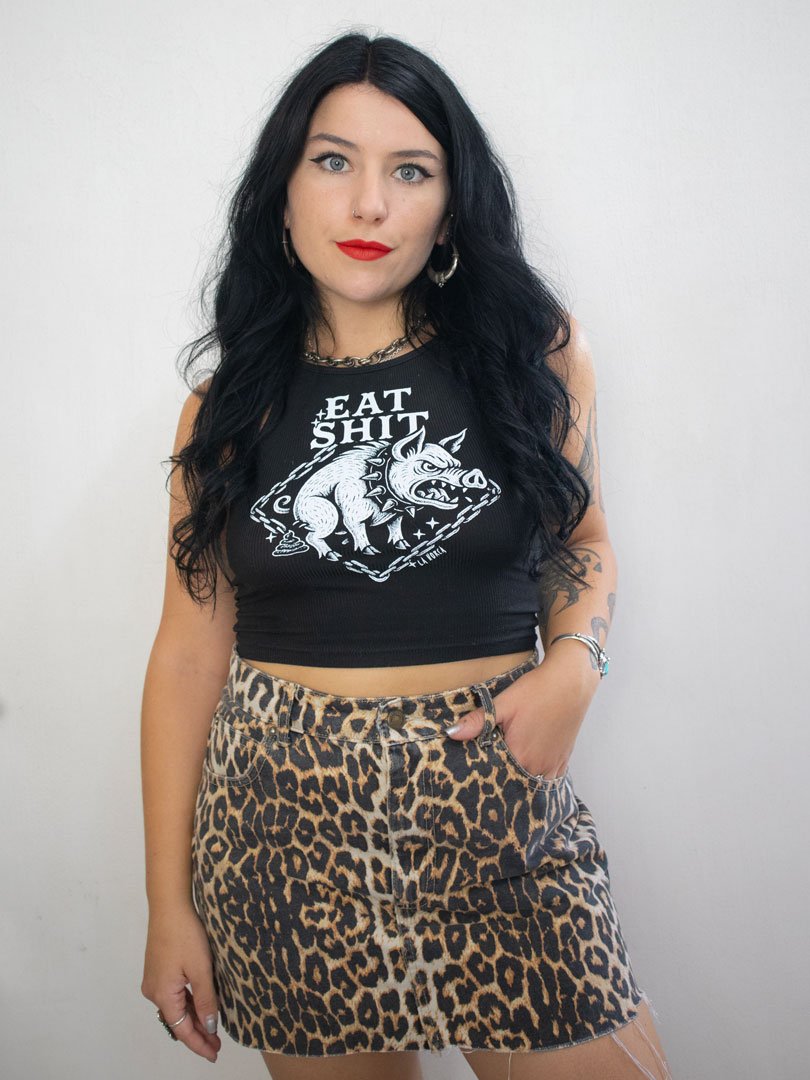 Perfecto para combinar con pantalones de tiro alto o faldas, el Eat Sh*t es el crop top negro ideal para quienes buscan un outfit lleno de personalidad.